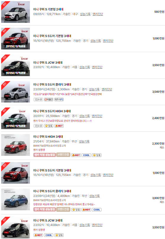여기까지 미니 쿠퍼의 중고차 가격을 알아보았습니다. 미니 쿠퍼 중고차 시세가 궁금하셨던 분들은 위 가격표 또는 엔카, Kcar, KB차차차와 같은 중고차 시세 사이트를 참고해서 구매하시면 좋을 것 같습니다.