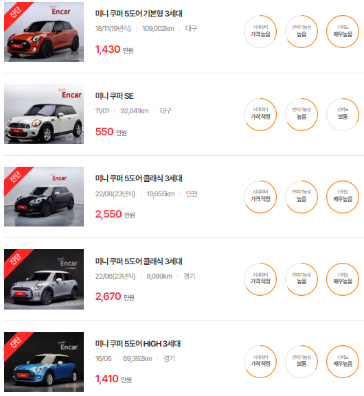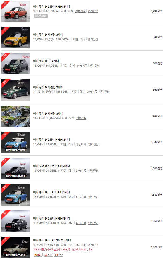 미니 쿠퍼 중고차 시세표입니다. 우리나라에서 가장 유명한 중고차 매매사이트인 엔카 사이트에 등록된 중고차 매물 기준입니다. 참고로 국내 중고차 사이트는 엔카, KB차차차, 보배드림 등이 있습니다.